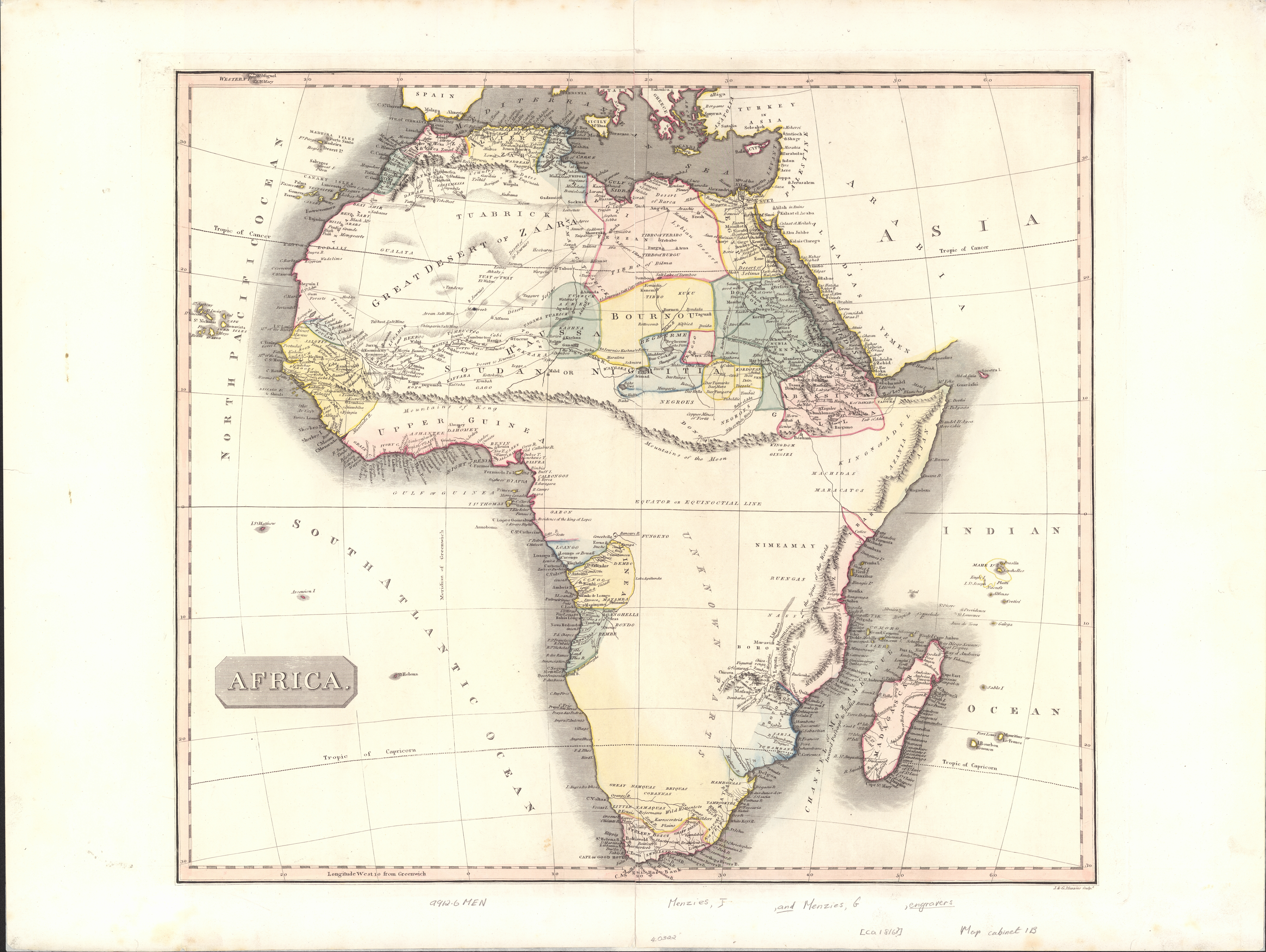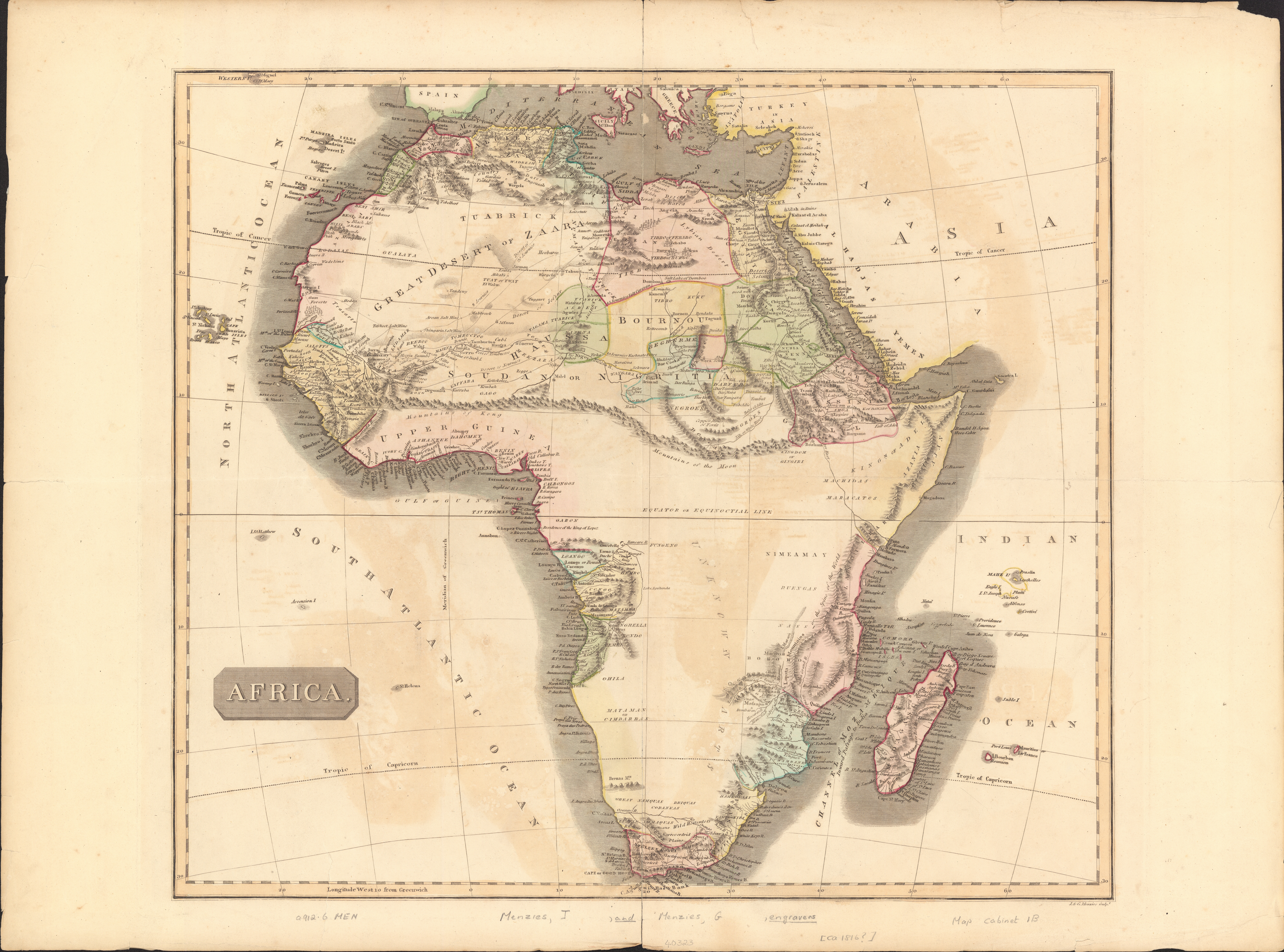 The map(40322), presumably after John Carey's Africa (1805), is a different ed. from no. 40323 and does not show the Brenas Mountains in what is now Namibia.