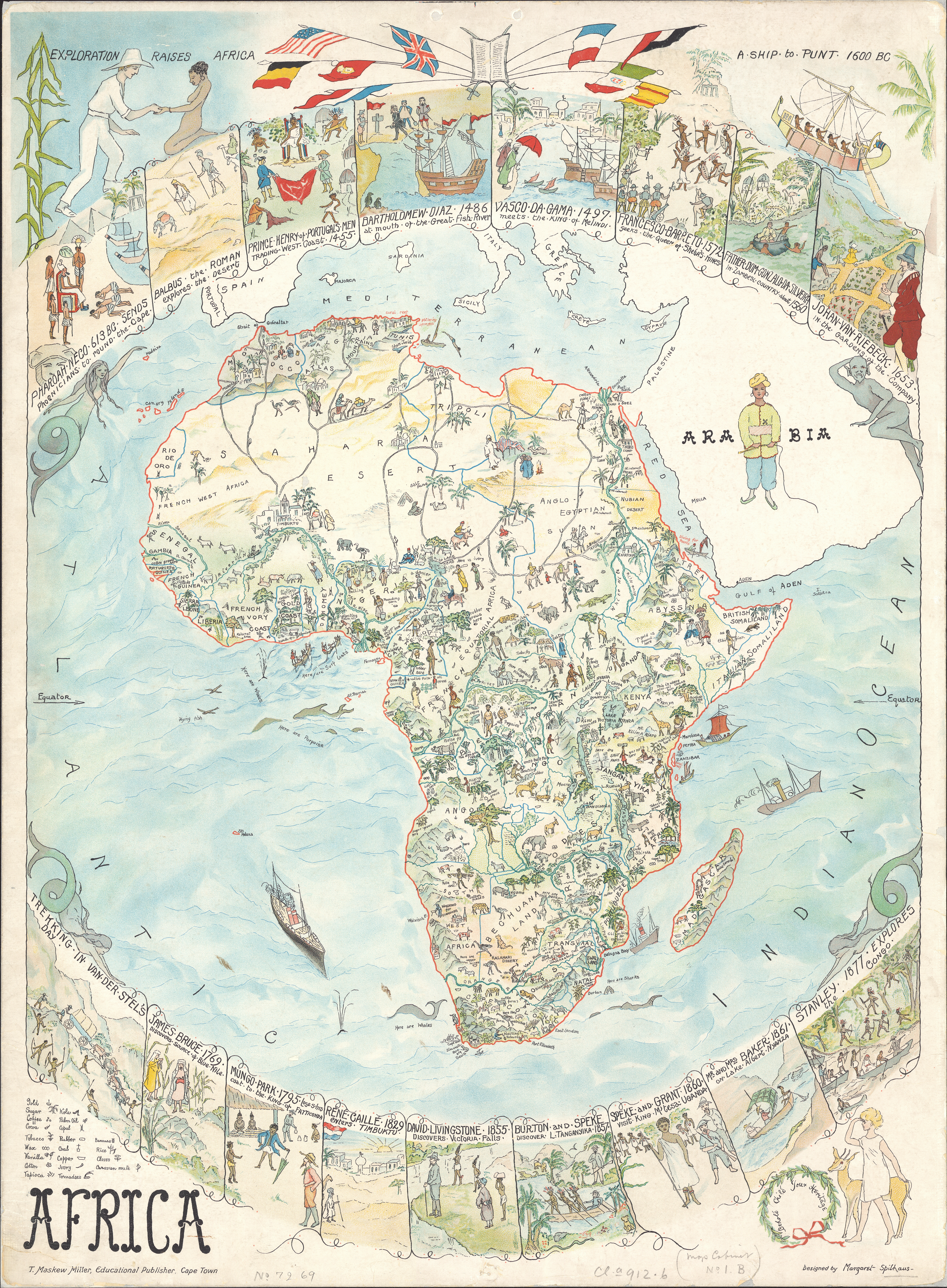 Includes 18 illustrations above and below map depicting historical events.